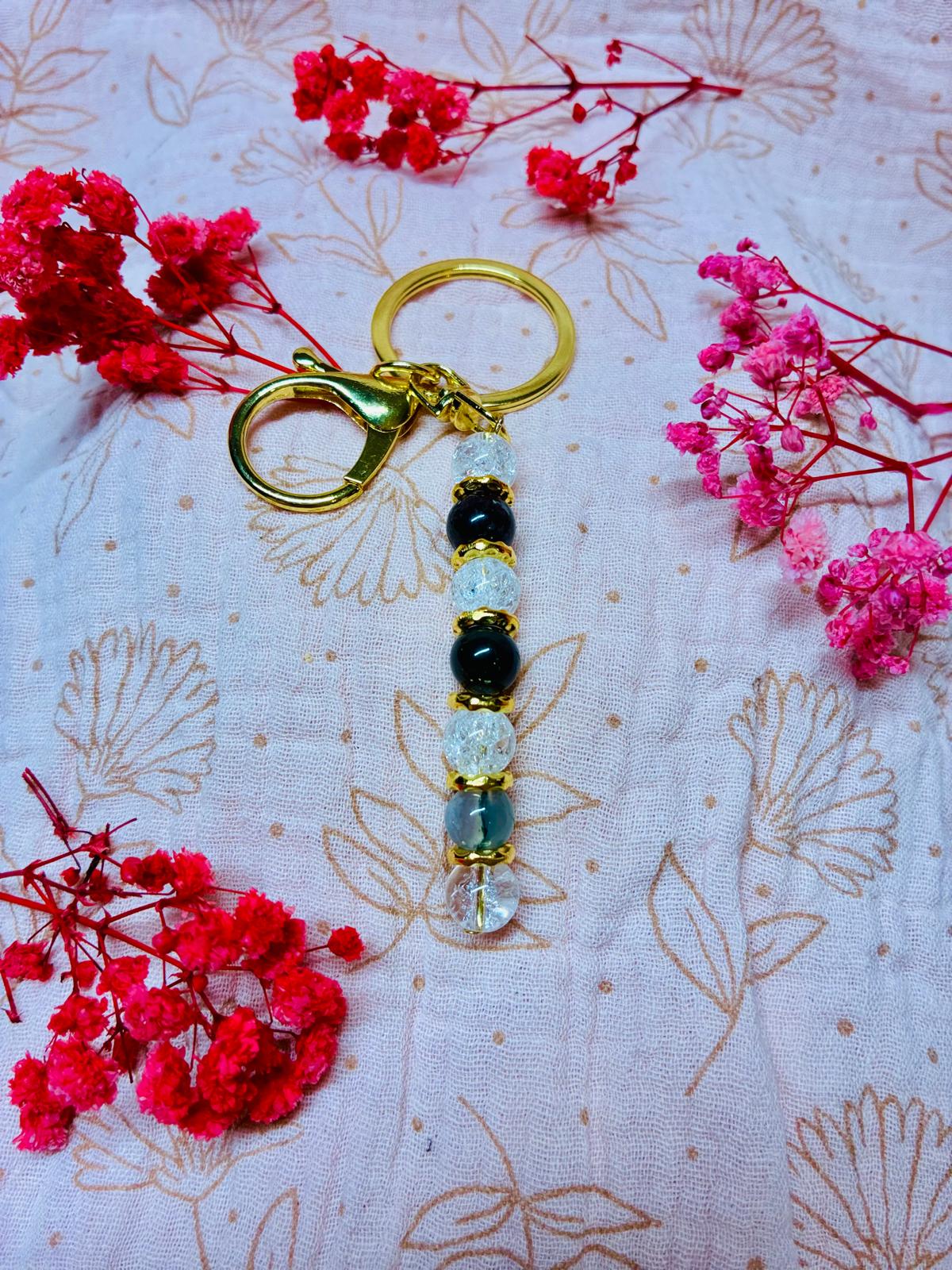 Ce porte-clés en Agate Mousse et Cristal de Roche est un véritable talisman du quotidien.