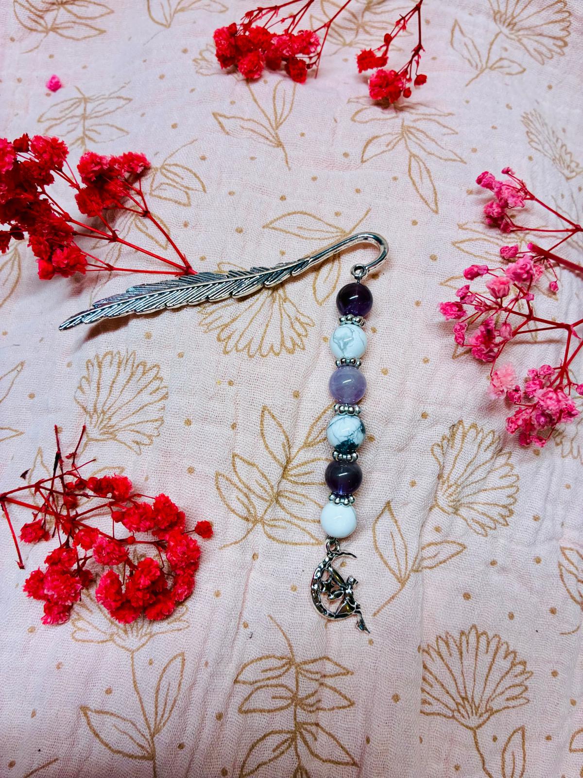 Ce marque-page en Howlite et Fluorite Violette est un compagnon de lecture apaisant et intuitif.